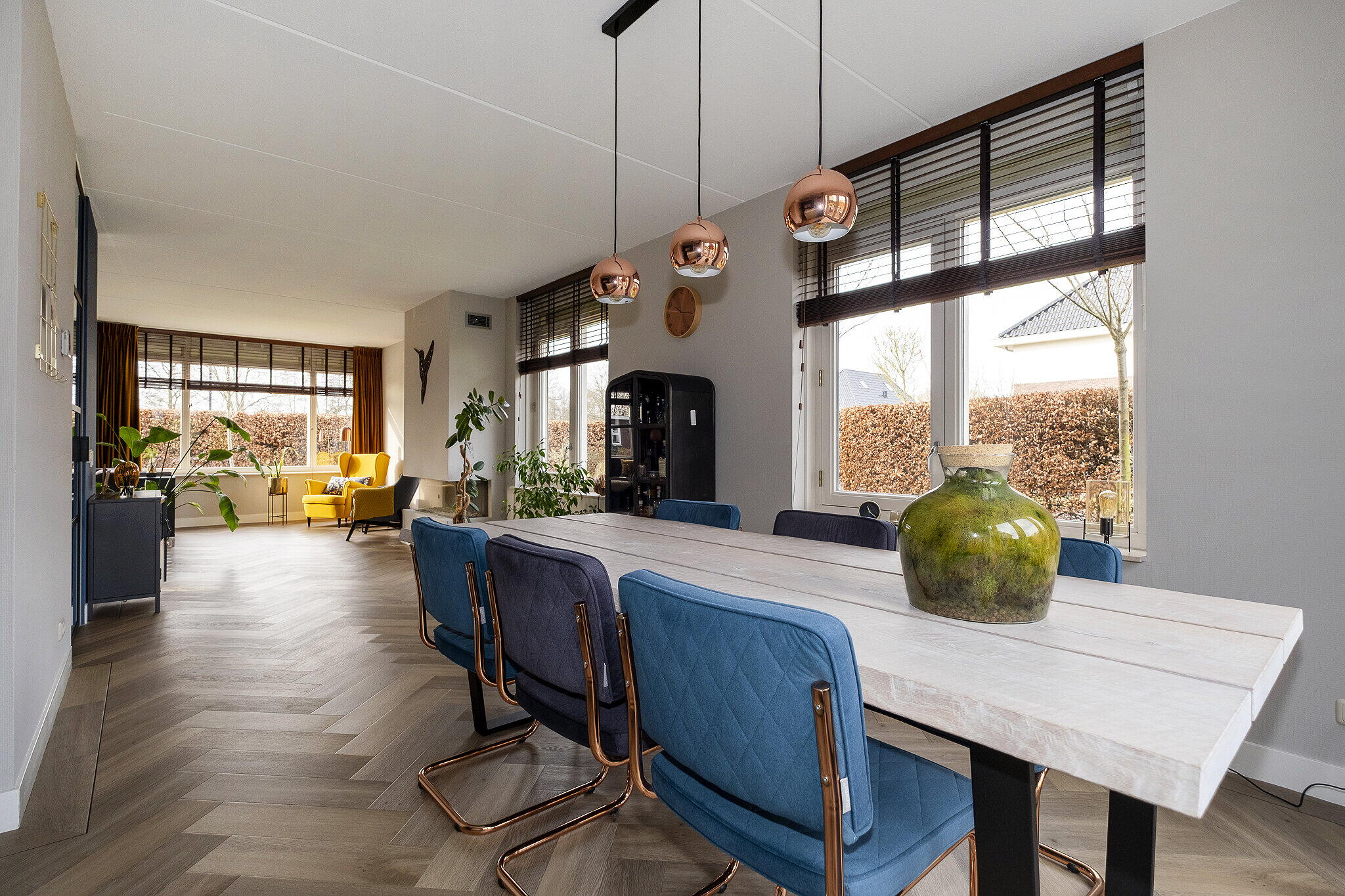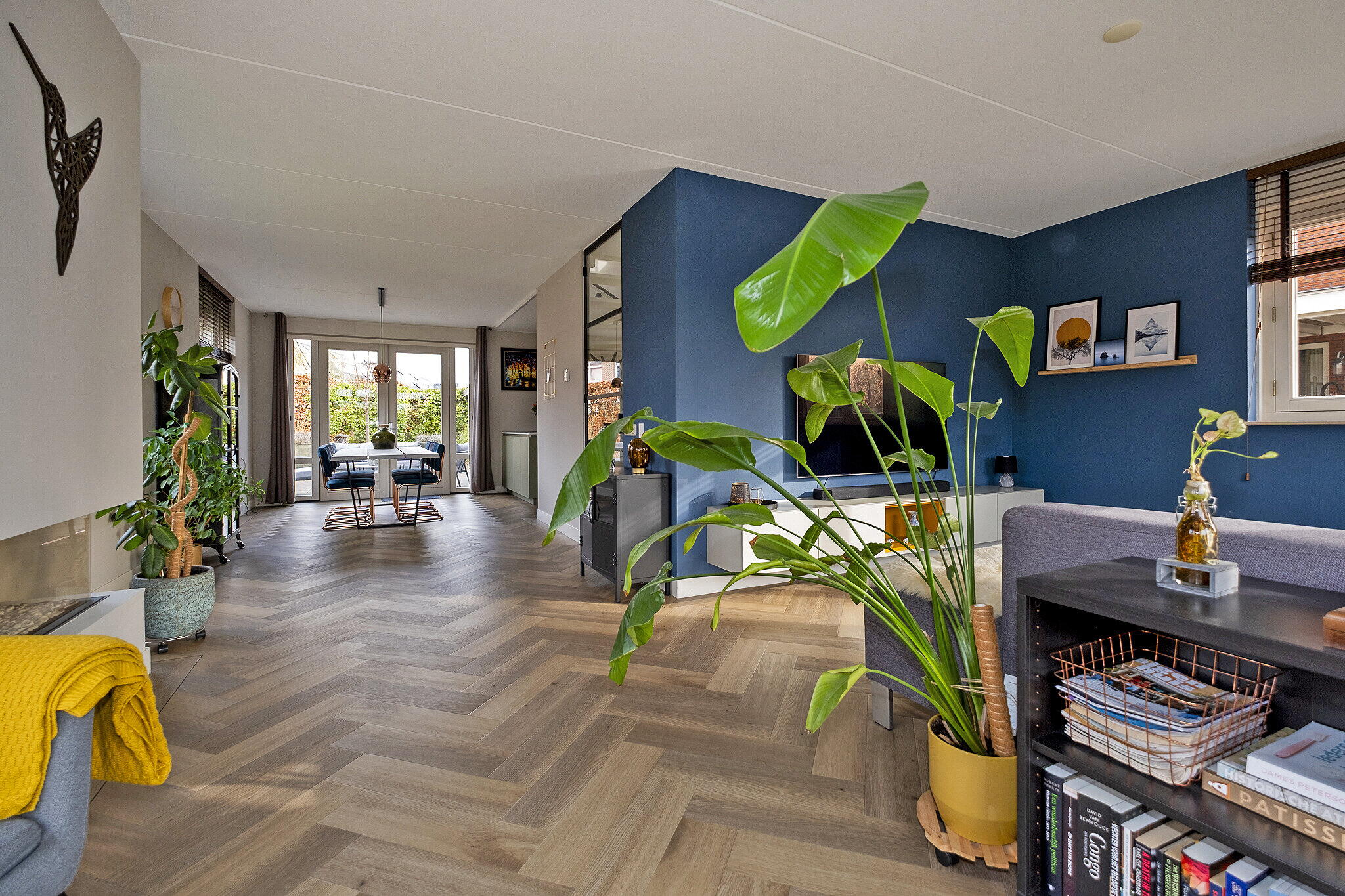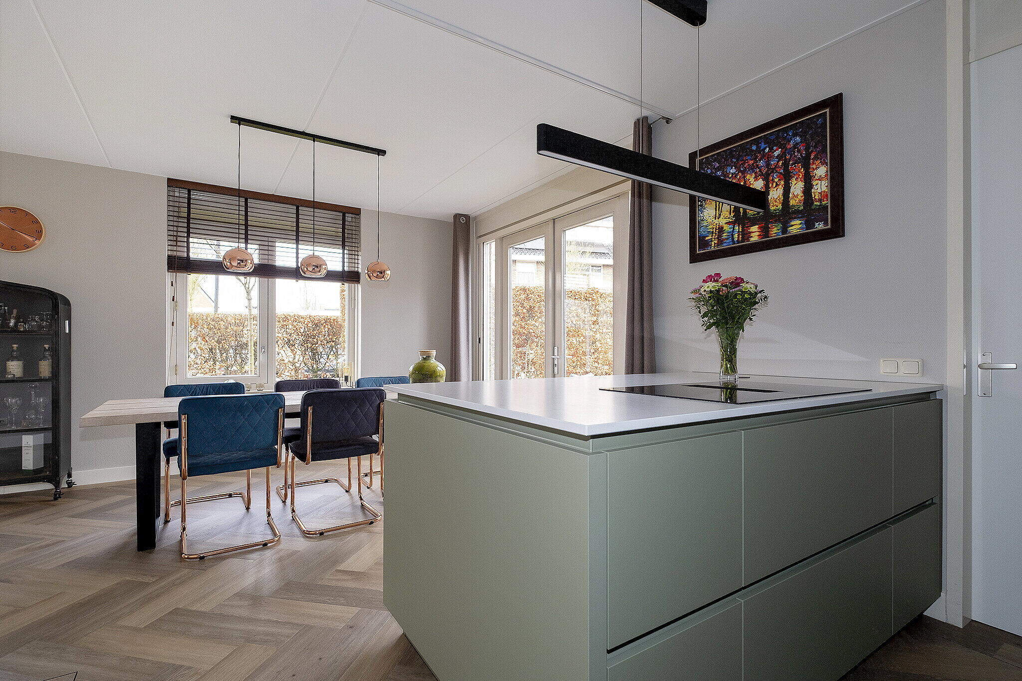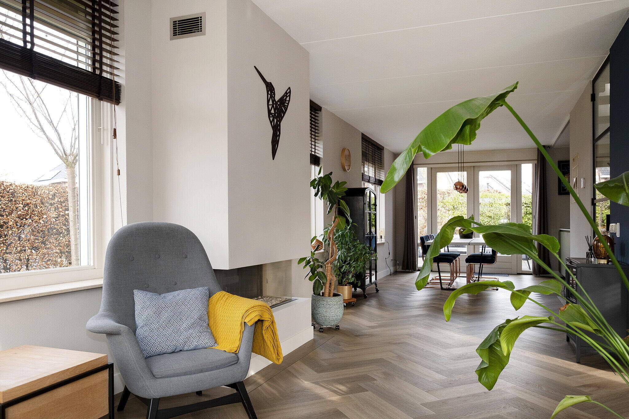 U komt binnen in een ruime hal met een toilet, meterkast en trapopgang. De royale woonkamer (ca. 47 m²) met fraaie pvc vloer is voorzien van vloerverwarming. De raampartijen rondom en openslaande tuindeuren maken dat de ruimte en verrassende lichtinval heeft. De moderne open keuken (ca. 10 m²) beschikt over een kookeiland, veel bergruimte en diverse inbouwapparatuur, zoals een koelkast, vaatwasser, combi-oven/magnetron, 4-pits inductiekookplaat met ingebouwde afzuiging (Novy), Quooker en koffiemachine. De bijkeuken heeft witgoedaansluitingen en volop bergruimte. Vanuit de bijkeuken is de garage bereikbaar. Aan de buitenzijde zijn op de zuid en westzijde van de woning rolluiken aangebracht.