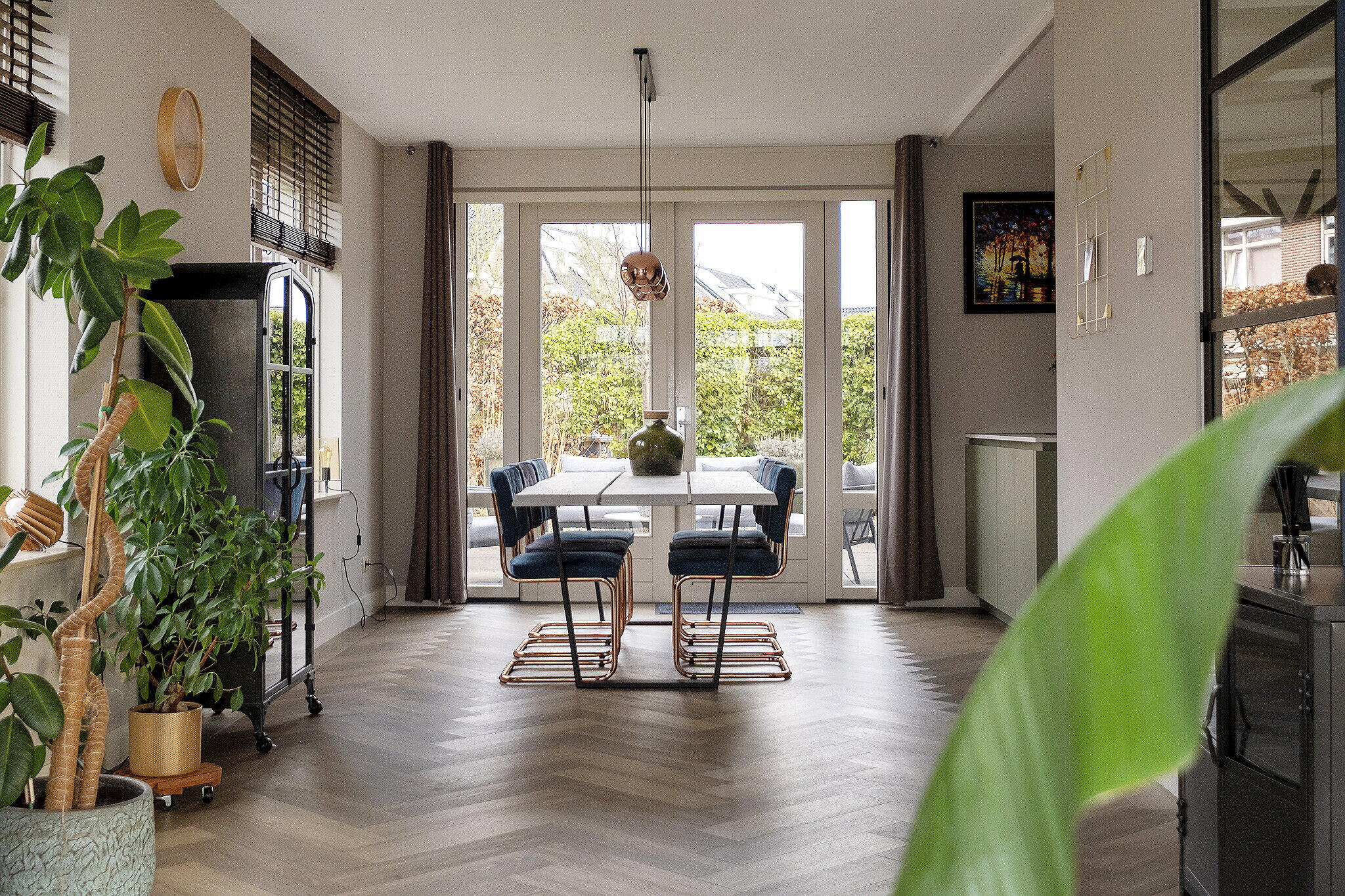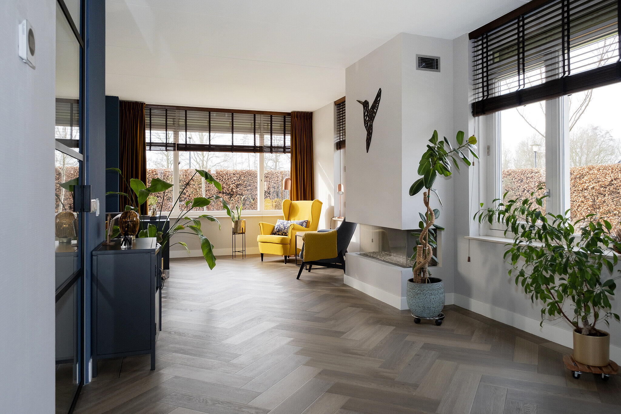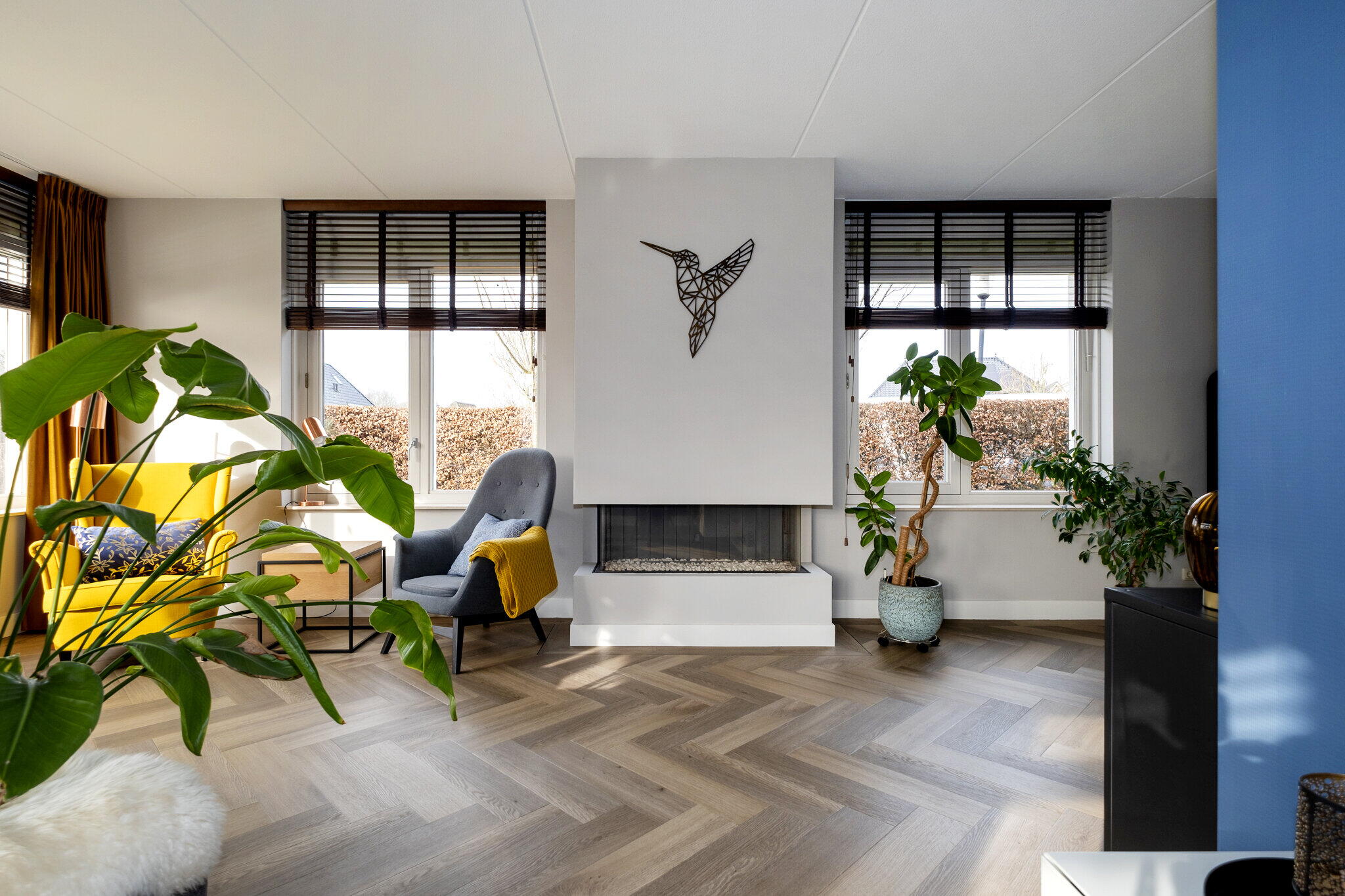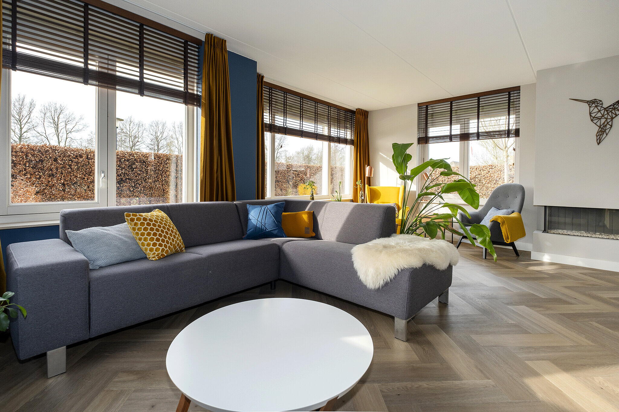 U komt binnen in een ruime hal met een toilet, meterkast en trapopgang. De royale woonkamer (ca. 47 m²) met fraaie pvc vloer is voorzien van vloerverwarming. De raampartijen rondom en openslaande tuindeuren maken dat de ruimte en verrassende lichtinval heeft. De moderne open keuken (ca. 10 m²) beschikt over een kookeiland, veel bergruimte en diverse inbouwapparatuur, zoals een koelkast, vaatwasser, combi-oven/magnetron, 4-pits inductiekookplaat met ingebouwde afzuiging (Novy), Quooker en koffiemachine. De bijkeuken heeft witgoedaansluitingen en volop bergruimte. Vanuit de bijkeuken is de garage bereikbaar. Aan de buitenzijde zijn op de zuid en westzijde van de woning rolluiken aangebracht.