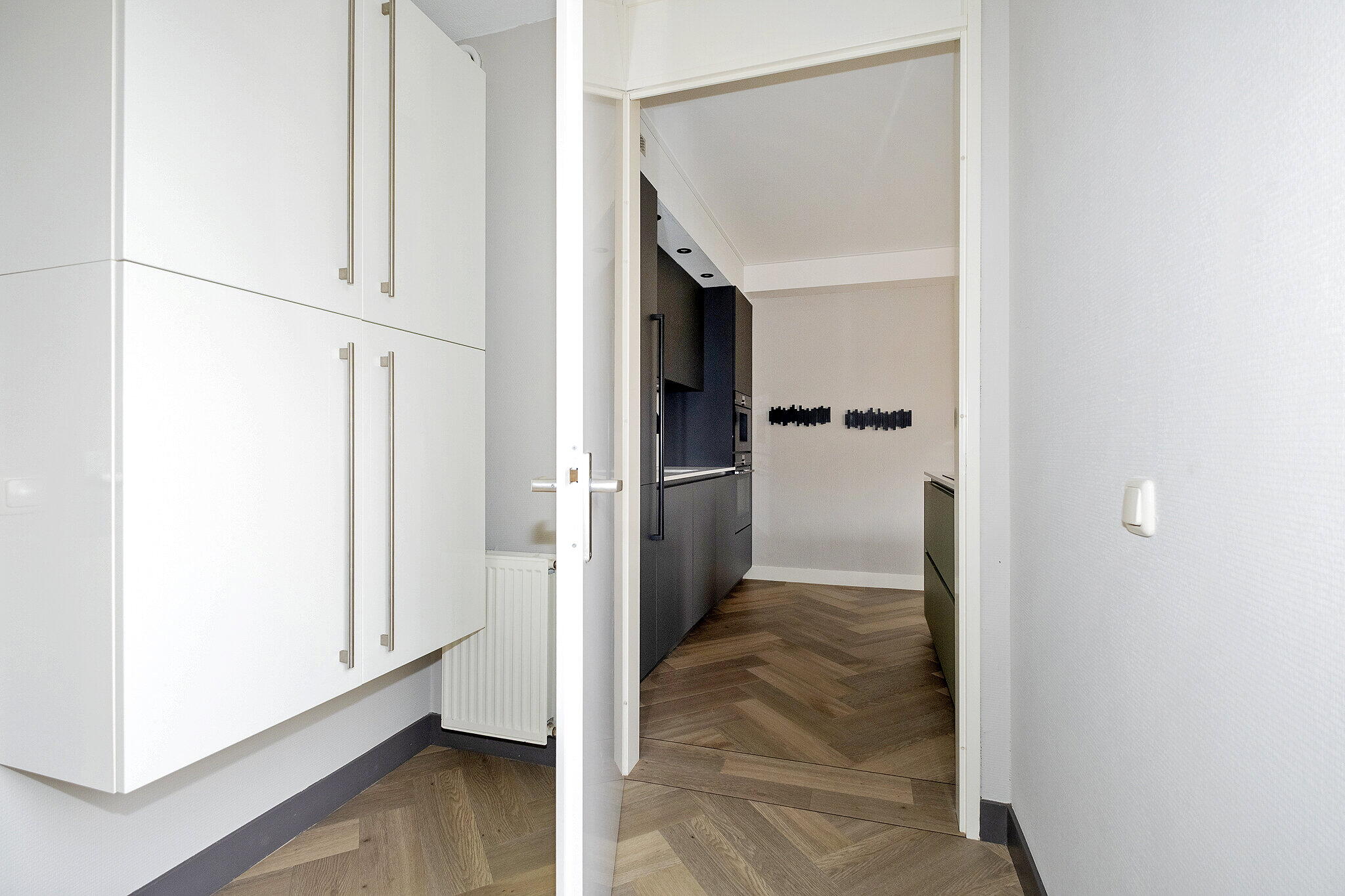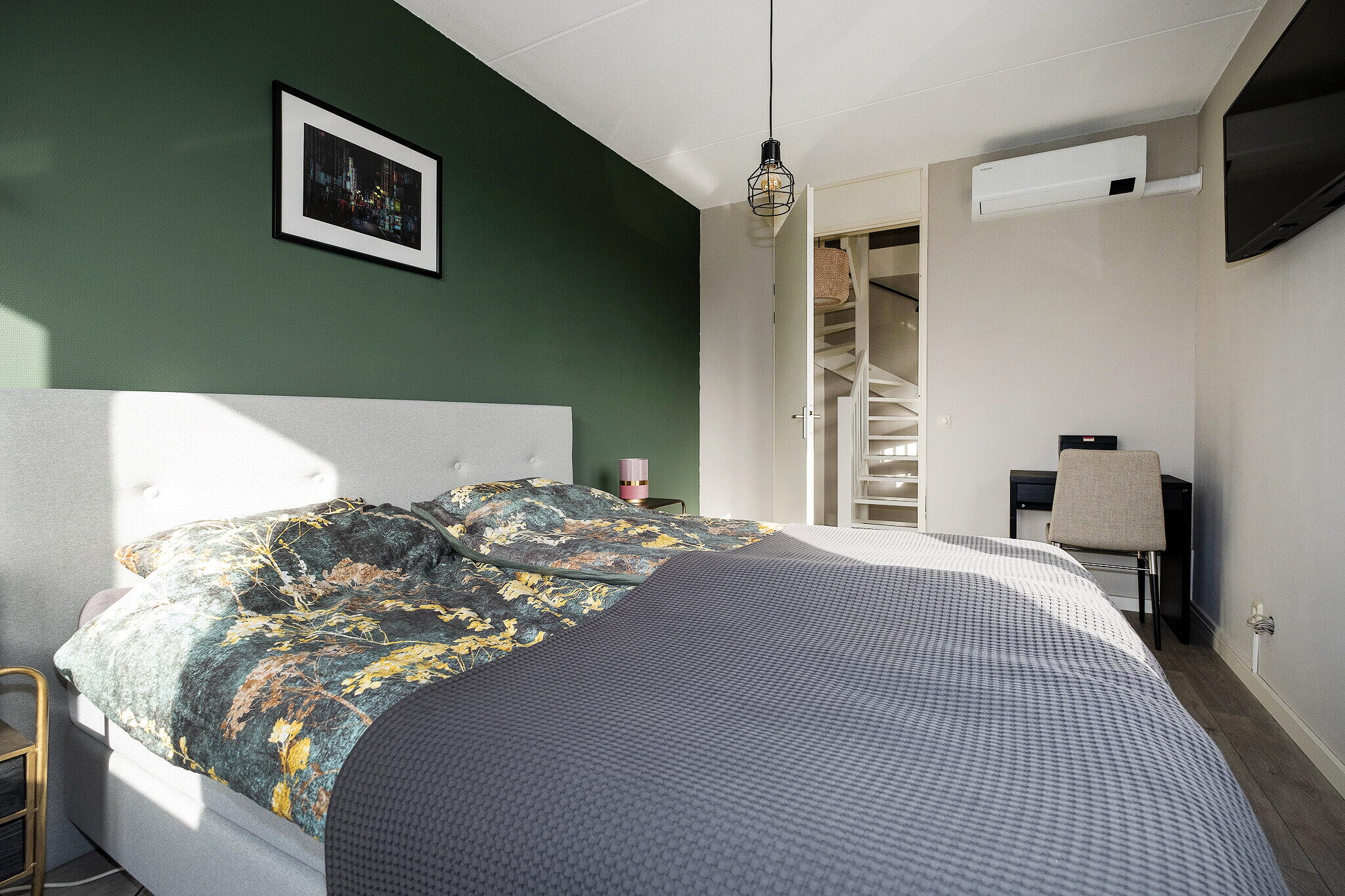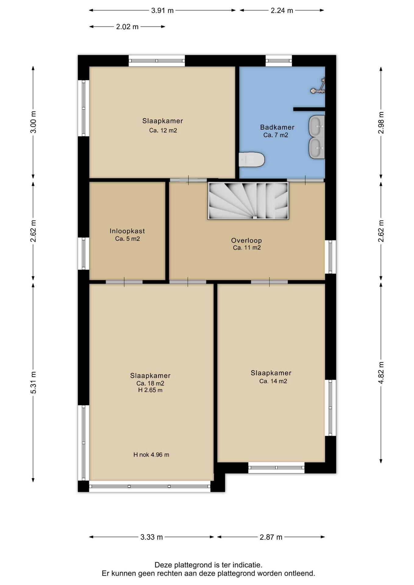 De lichte overloop leidt naar drie slaapkamers (ca. 18 m², ca. 14 m² en ca. 12 m²) en de badkamer (ca. 7 m²). De moderne badkamer is uitgerust met een inloopdouche, toilet en meubel met dubbele wastafel. Vanuit de grootste slaapkamer loop je een fijne inloopkast (ca. 5 m²) binnen. De slaapkamer aan de voorzijde heeft de beschikking over airconditioning.
