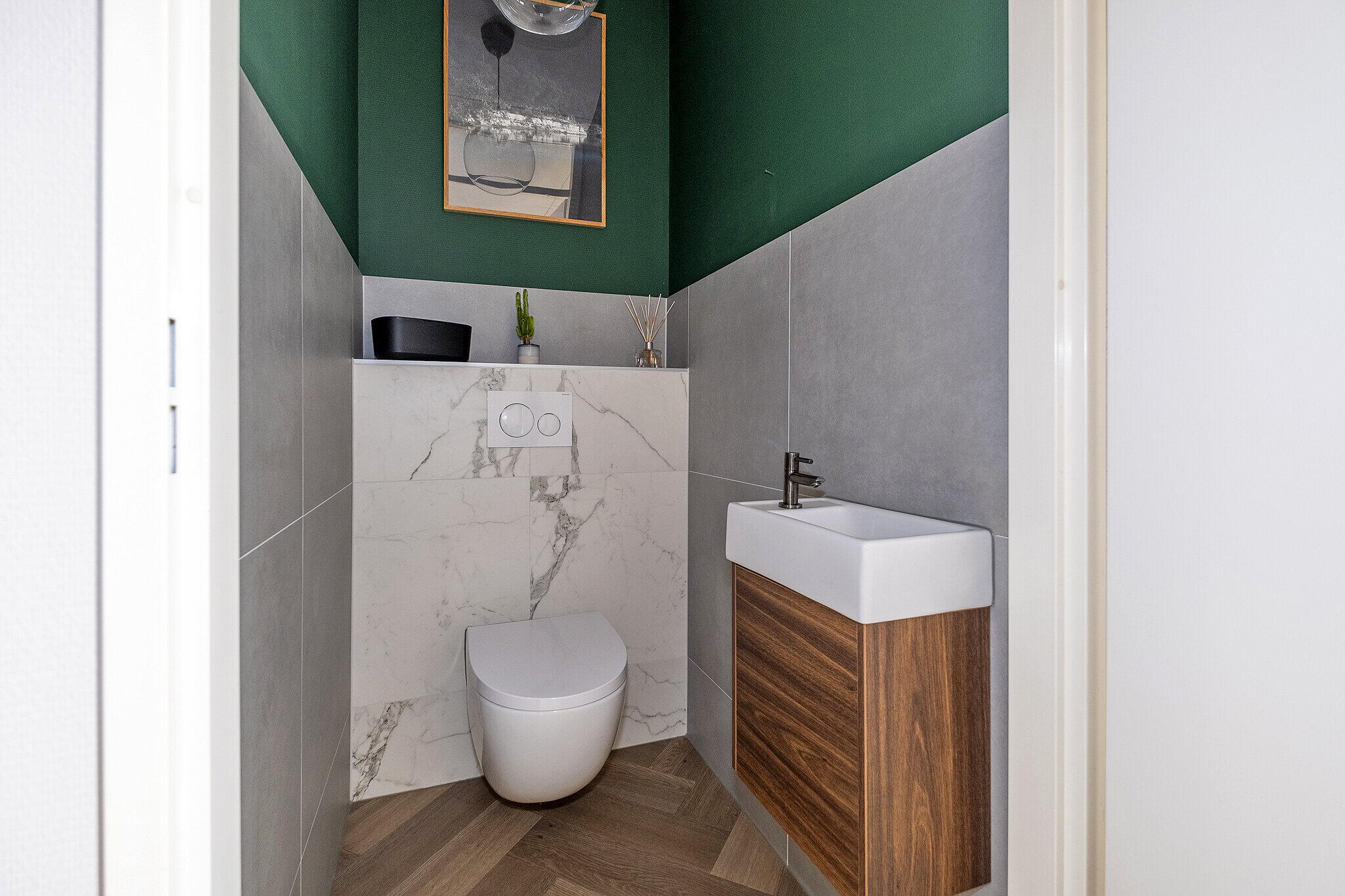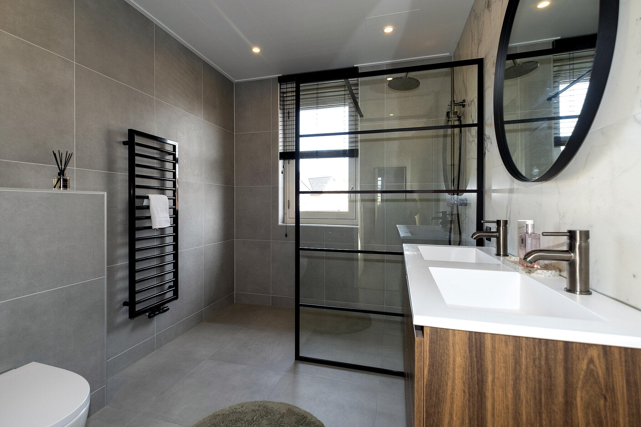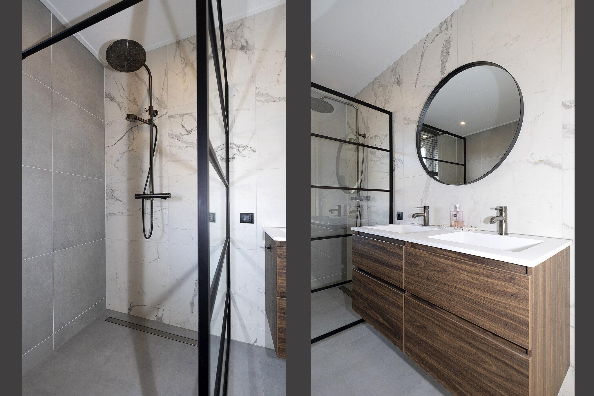 - Toilet, dubbele wastafel, wastafelmeubel, inloopdouche
