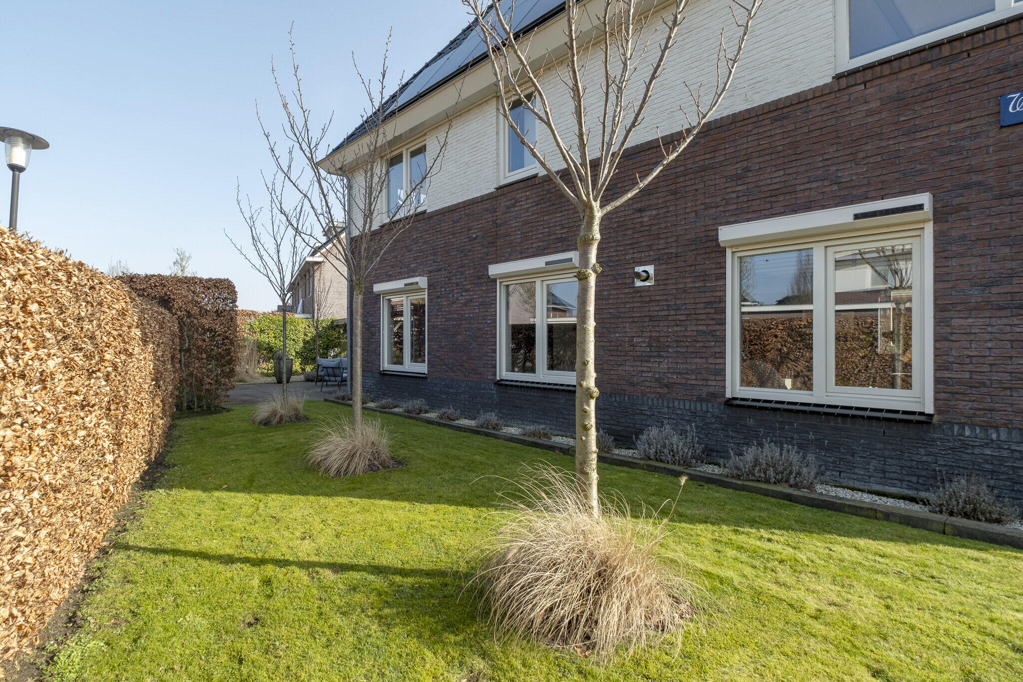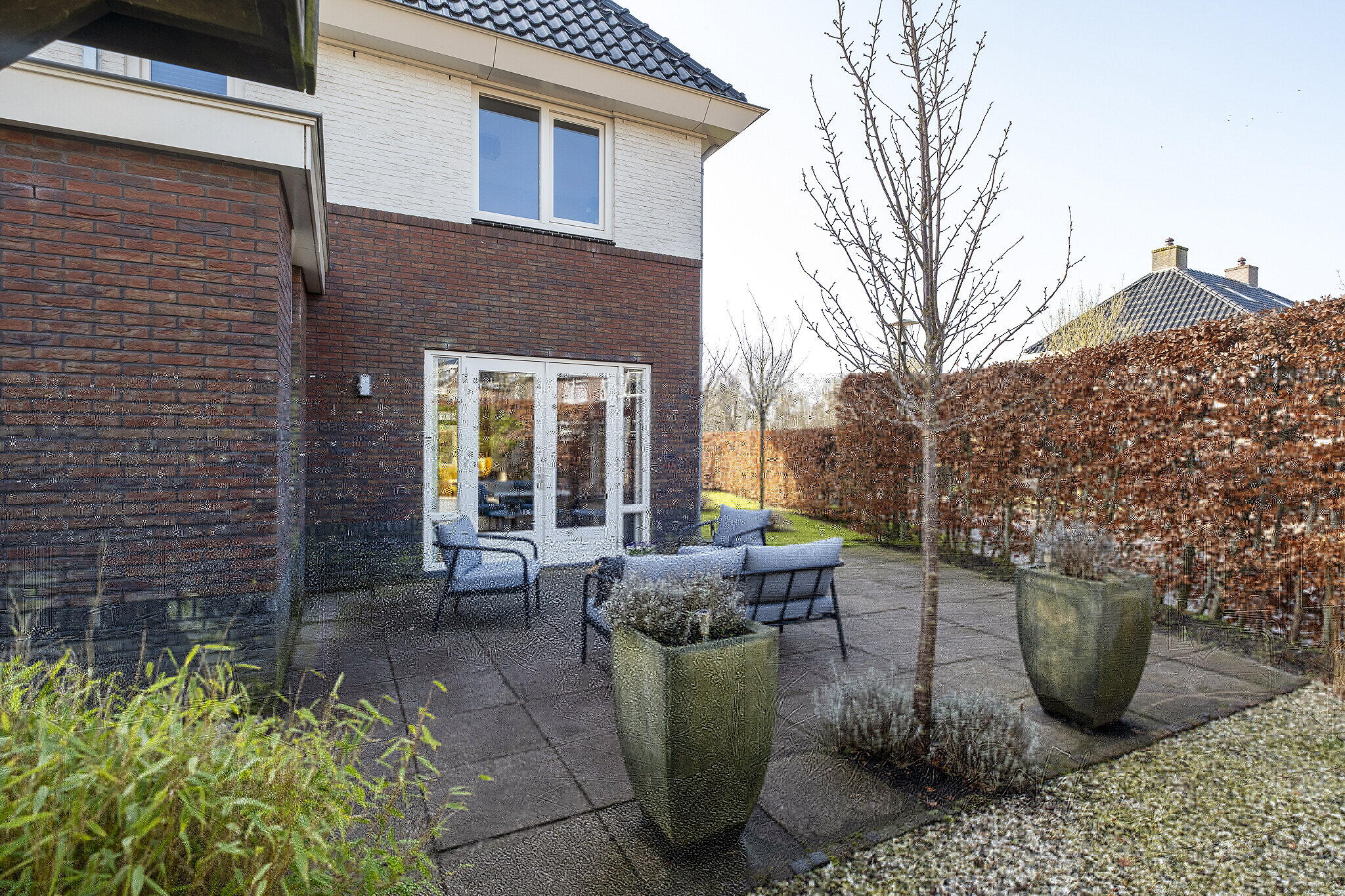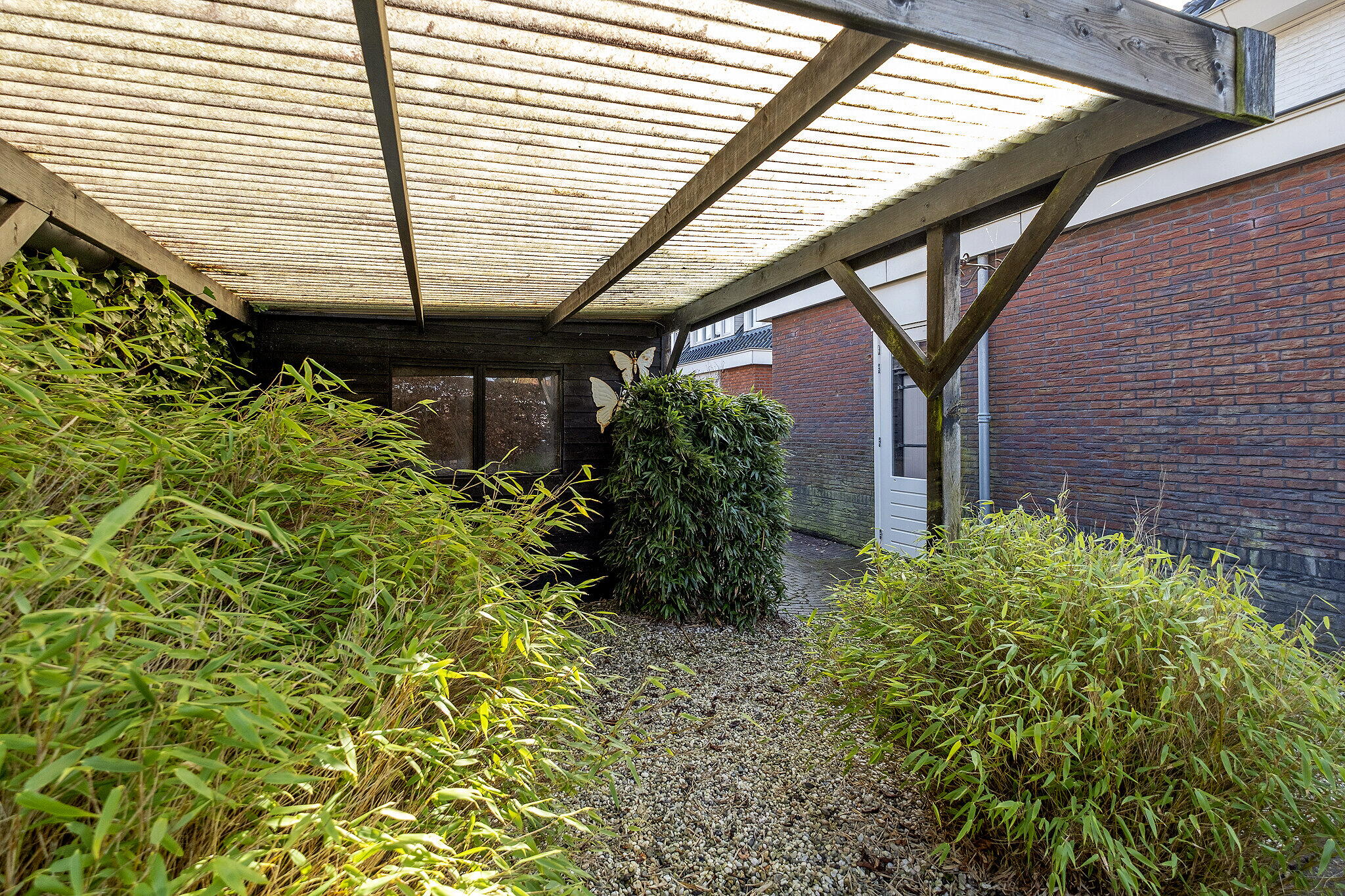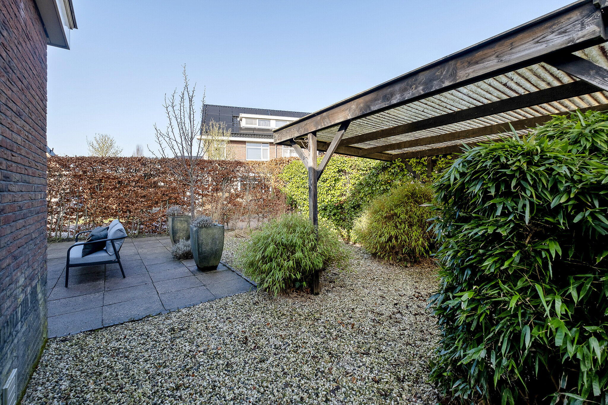 De stijlvol met groen aangelegde tuin is onderhoudsarm, maar biedt optimaal buitencomfort. Het hoekperceel waarborgt privacy, met verschillende terrassen in zowel zon als een plekje in de schaduw. Achter in de tuin is een houten berging met een kleine overkapping geplaatst.