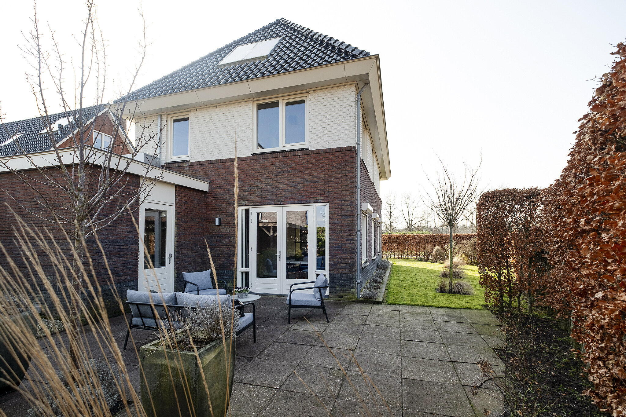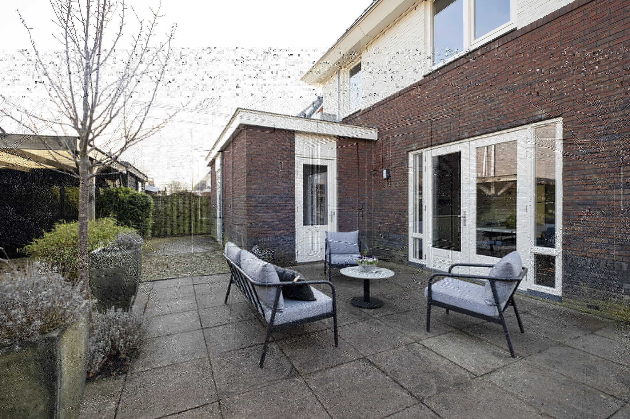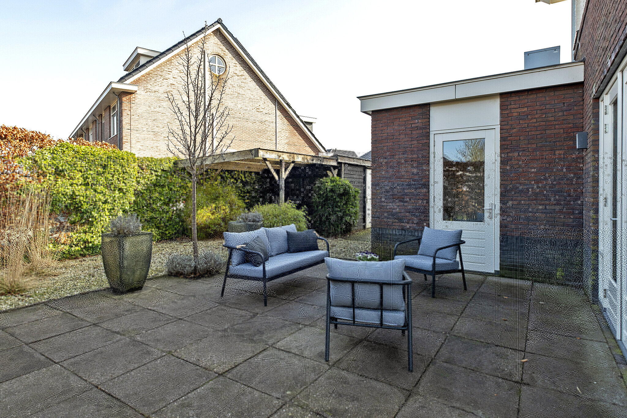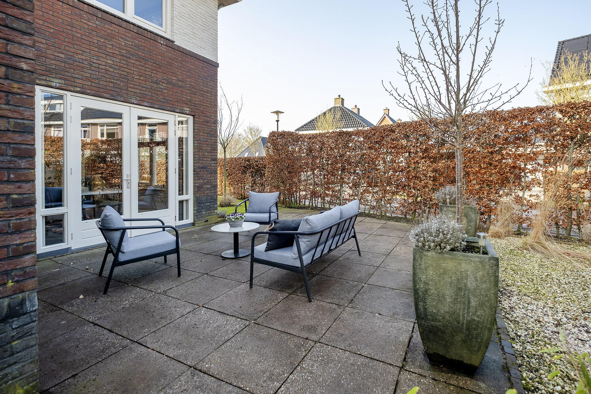 De stijlvol met groen aangelegde tuin is onderhoudsarm, maar biedt optimaal buitencomfort. Het hoekperceel waarborgt privacy, met verschillende terrassen in zowel zon als een plekje in de schaduw. Achter in de tuin is een houten berging met een kleine overkapping geplaatst.