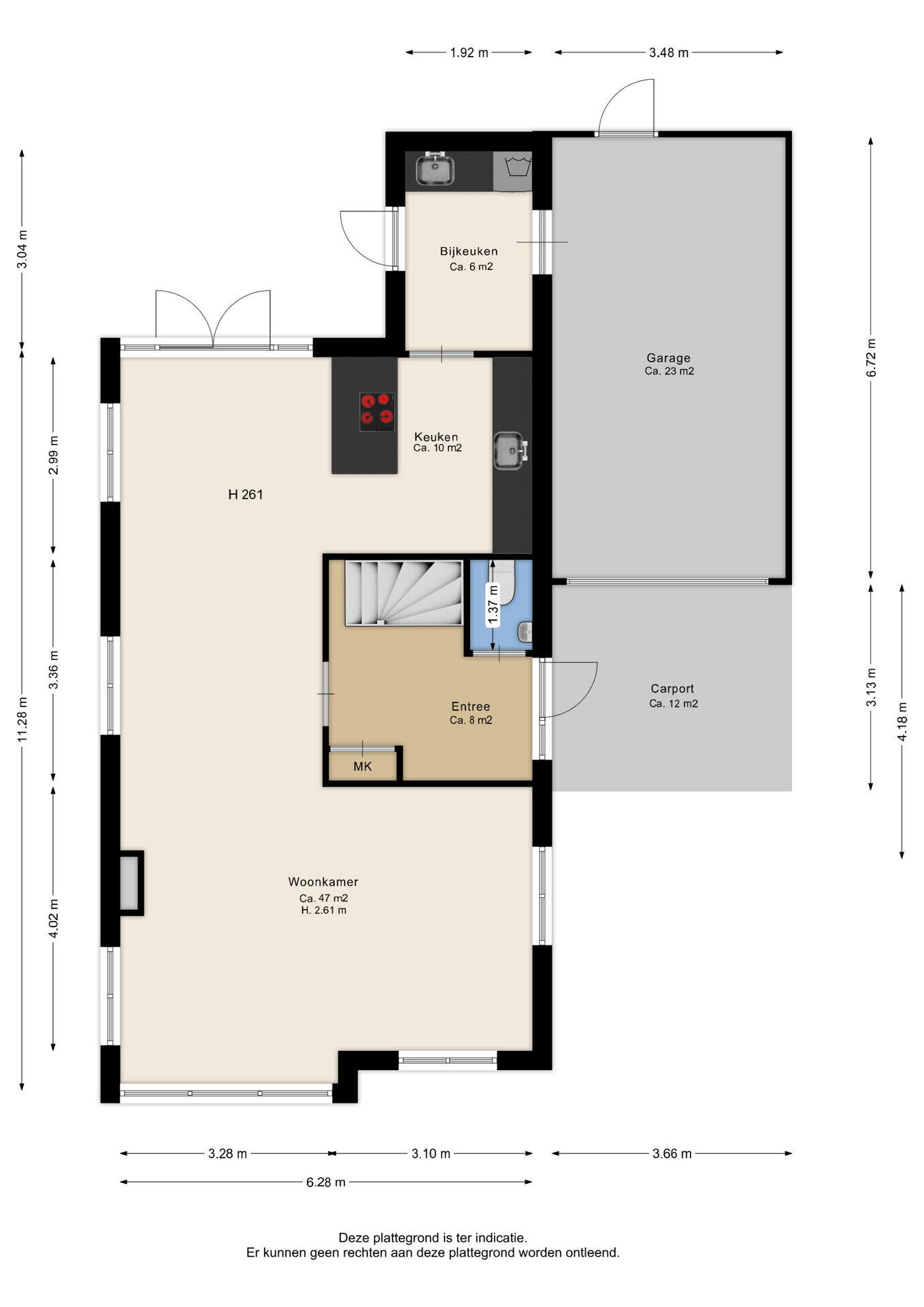 De aangebouwde stenen garage (ca. 23 m²) met carport en elektrische garagedeur heeft een loopdeur naar de achtertuin. De garage beschikt eveneens over voldoende ruimte voor opslag.